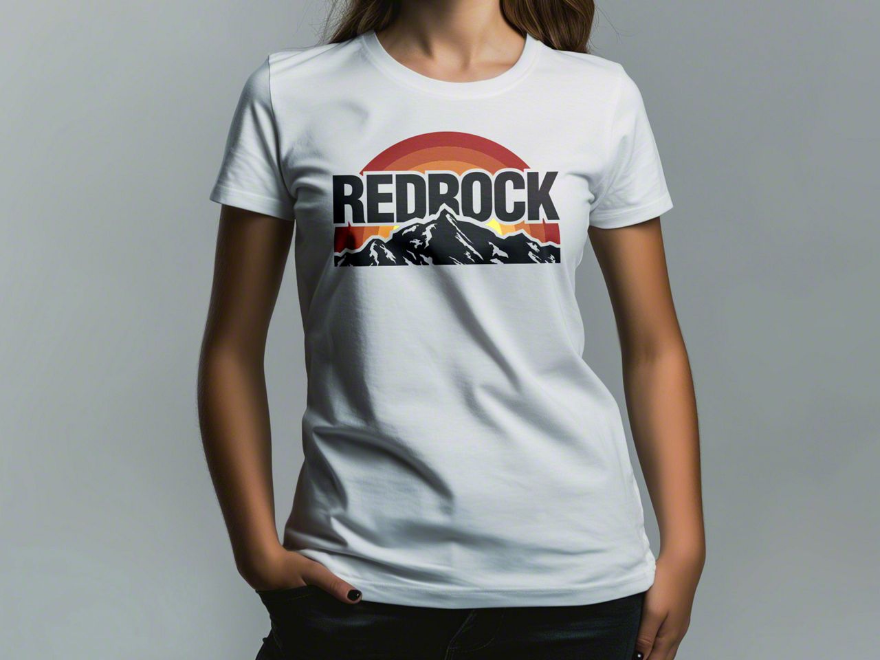 RedRock Scape. This RedRock Summit T-Shirt is an extremely cool fashion piece that shows your loyalty to the brand. The white shirt features "REDROCK" in dark lettering with a mountain range below and a red, yellow and orange sun surrounding the letters.