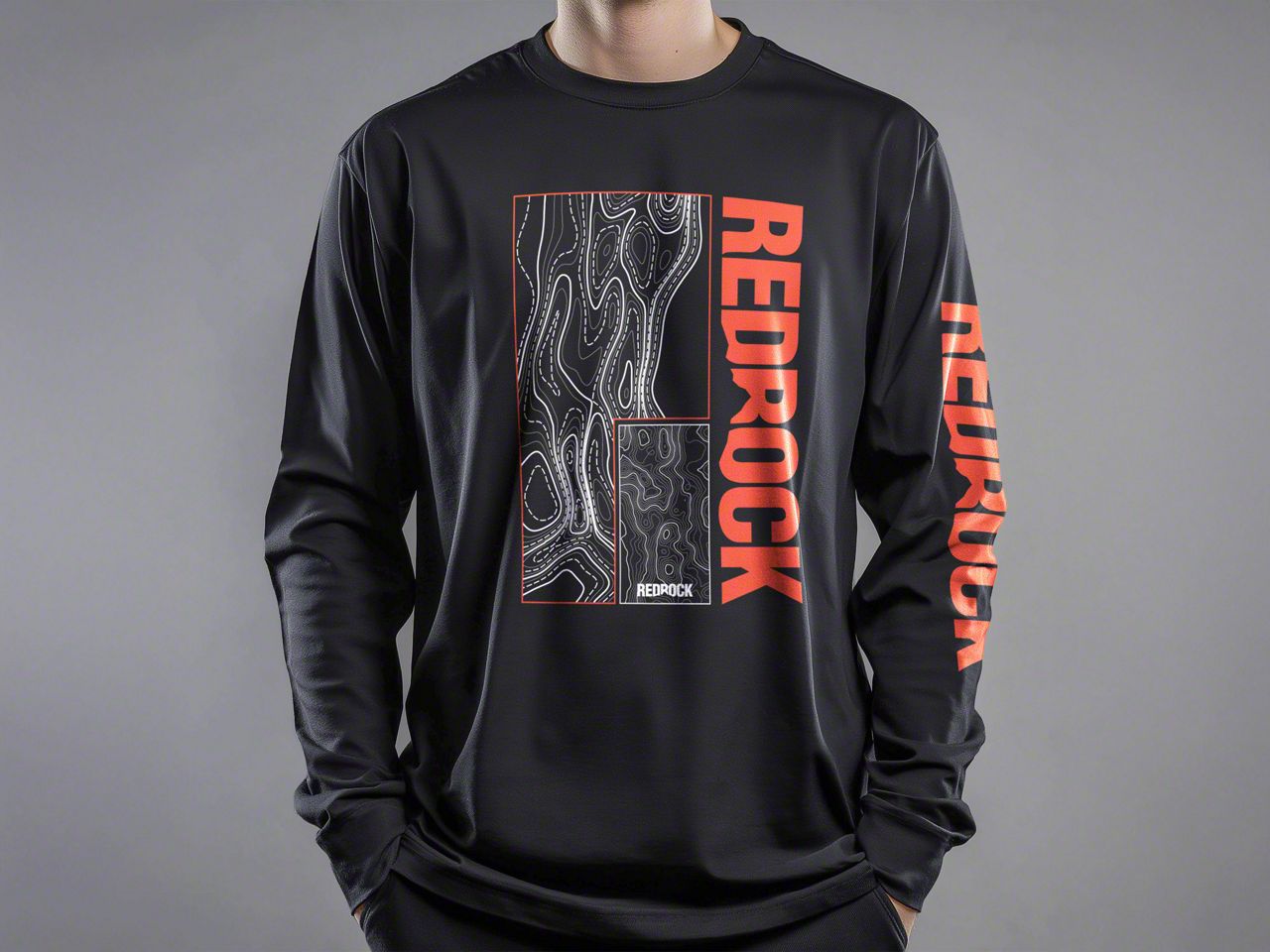 RedRock Brand. A great way to display the ruggedness of the RedRock brand with the RedRock Topographic Long Sleeve T-Shirt. This shirt has a large topographic map on the back with an inset map and "REDROCK" down the sleeve, next to the map and in the inset.