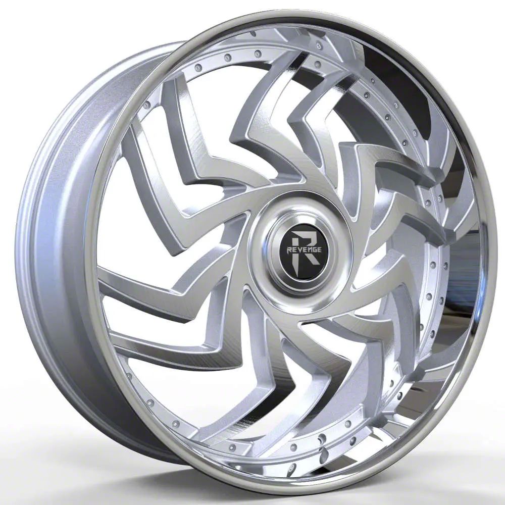Revenge Luxury Wheels RL-107 Big Floater Silver Brushed Face with Chrome SSL 6-Lug Wheel; 24x9; 25mm Offset This wheel offers a sleek and modern design that enhances the visual appeal of your vehicle. Its metallic gunmetal finish adds a touch of elegance and sophistication, making it a perfect fit for those who want to make a bold statement on the road.