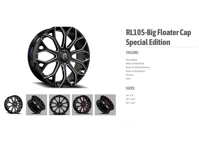 Revenge Luxury Wheels RL-105 Big Floater Gloss Black 6-Lug Wheel; 28x9.5; 25mm Offset: Redefine your vehicle's style with the Revenge Luxury Wheels RL-105 Big Floater Gloss Black 6-Lug Wheel. This wheel's elegant design and striking finish embody a blend of sophistication and boldness, perfectly complementing a wide array of vehicle aesthetics. Crafted from high-quality materials, it's a testament to durability and style.