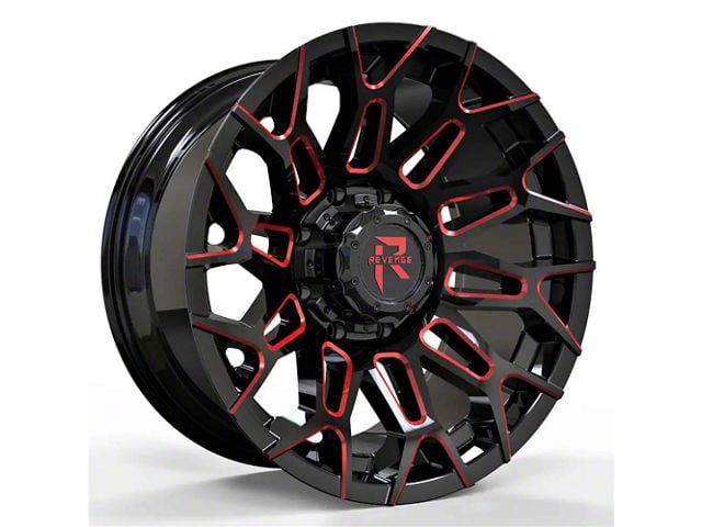 Revenge Off-Road Wheels RV-203 Black and Red Milled 5-Lug Wheel; 20x10; -19mm Offset exudes sophistication with its finish, offering a sleek and modern appeal to any vehicle it adorns. The design is meticulously crafted to enhance the aesthetic of your vehicle, giving it a distinctive and upscale look. Perfect for those seeking to elevate their vehicle's style, this wheel blends seamlessly with both contemporary and classic vehicle designs, making it a versatile choice for a wide range of vehicles. Its robust construction ensures durability, making it a reliable choice for drivers who value both style and quality.