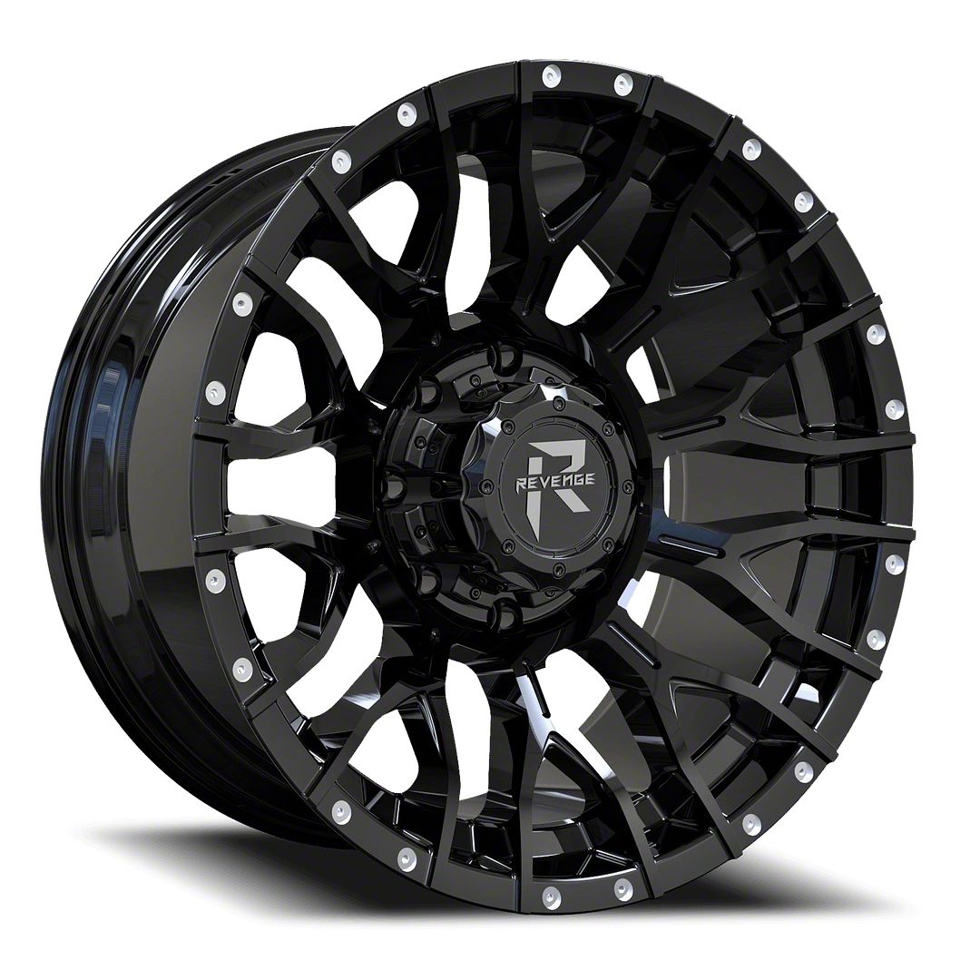 Revenge Off-Road Wheels RV-201 Gloss Black with Dots 8-Lug Wheel; 20x9; 0mm Offset: Redefine your vehicle's style with the Revenge Off-Road Wheels RV-201 Gloss Black with Dots 8-Lug Wheel. This wheel's elegant design and striking finish embody a blend of sophistication and boldness, perfectly complementing a wide array of vehicle aesthetics. Crafted from high-quality materials, it's a testament to durability and style.
