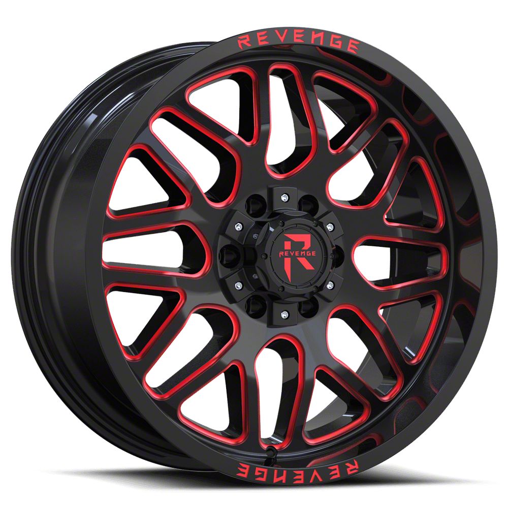 This 20x9 Revenge Off-Road Wheels RV-206 Black and Red Milled 8-Lug Wheel is completed in a high-quality black and red finish with milled accents that will be the envy of everyone. For added protection and looks, there is a durable clear coat that can handle the rigors of daily driving.