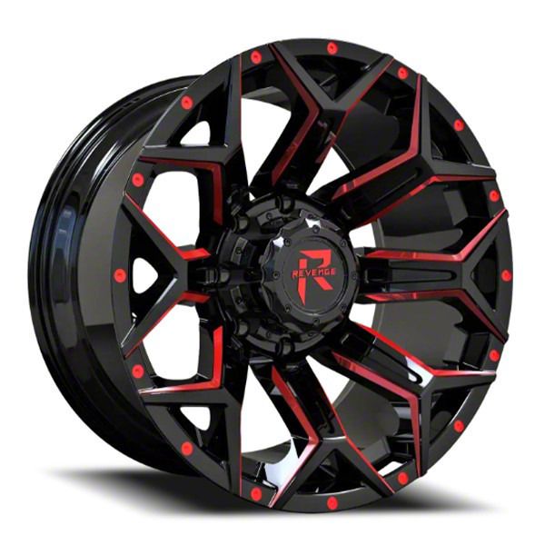 Revenge Off-Road Wheels RV-202 Black and Red Milled 8-Lug Wheel; 20x10; -19mm Offset This Revenge Off-Road Wheels RV-202 Black and Red Milled 8-Lug Wheel; 20x10; -19mm Offset brings a sleek and modern touch to your vehicle with its striking design. Its refined finish and bold styling make it an excellent choice for those looking to enhance their car’s visual appeal. Whether you're aiming for a sporty look or a more aggressive stance, this wheel stands out as a premium addition. Perfect for drivers who appreciate a stylish upgrade.