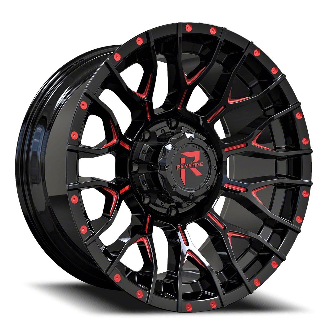 Revenge Off-Road Wheels RV-201 Black and Red Milled 8-Lug Wheel; 20x9; 0mm Offset: Redefine your vehicle's style with the Revenge Off-Road Wheels RV-201 Black and Red Milled 8-Lug Wheel. This wheel's elegant design and striking finish embody a blend of sophistication and boldness, perfectly complementing a wide array of vehicle aesthetics. Crafted from high-quality materials, it's a testament to durability and style.