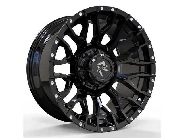 The 20x10 Revenge Off-Road Wheels RV-201 Gloss Black with Dots 8-Lug Wheel is completed in a high-quality gloss black finish with contrasting accents. There's a durable clear coat that looks amazing and protects the wheel against the rigors of driving.