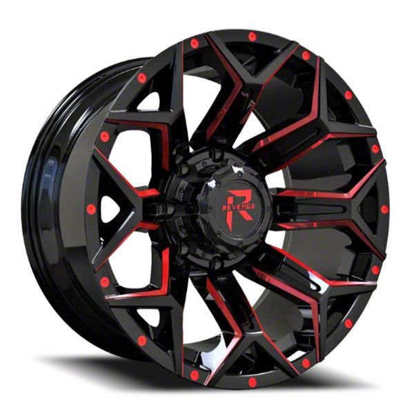Revenge Off-Road Wheels RV-202 Black and Red Milled 8-Lug Wheel; 20x10; -19mm Offset. Enhance your vehicle's look with the Revenge Off-Road Wheels RV-202 Black and Red Milled 8-Lug Wheel. This premium wheel adds a touch of elegance and class to your vehicle, complementing its sophisticated aesthetic.