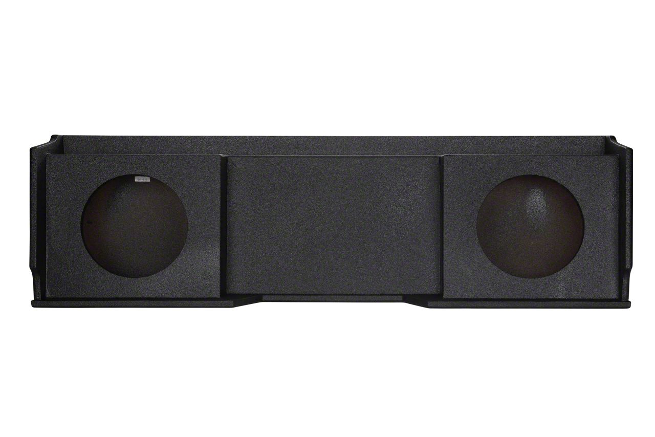 Construction and Appearance. Built from 5/8-inch MDF and finished in a high-pressure polyurethane bed liner coating, this enclosure offers maximum durability and acoustic performance. Each chamber provides 0.77 cubic feet of air volume with a six-inch mounting depth to accommodate a wide range of subwoofer brands. The down-firing design increases output while protecting the subs from cargo and foot traffic.
