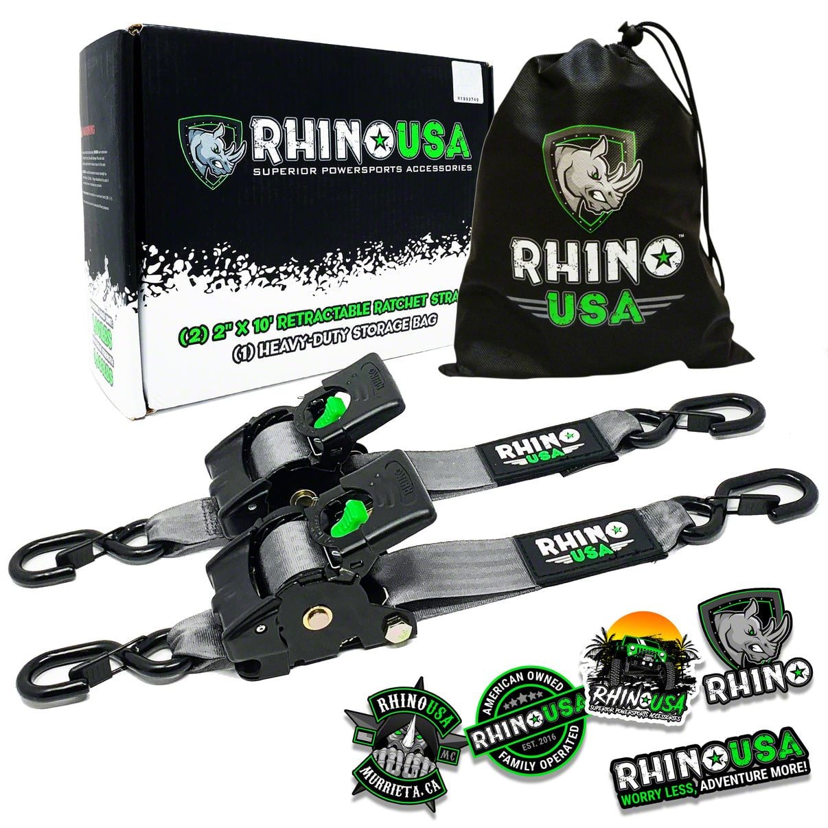 Application. The Rhino USA 2-Inch x 10-Foot Retractable Ratchet Straps are universally compatible, making them suitable for a variety of cargo and tie-down needs.