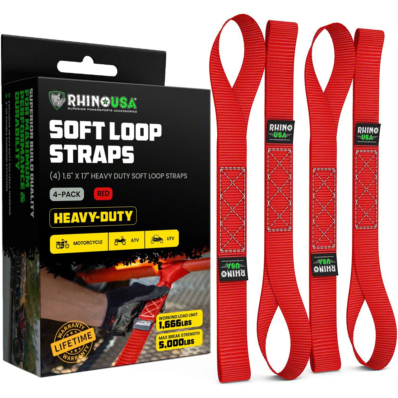 The Rhino USA Soft Loop Tie Down Straps feature a soft loop design that ensures a secure and gentle grip on your cargo. The soft loop prevents any scratching or damage to delicate surfaces, making it perfect for securing motorcycles, ATVs, or other items with sensitive finishes. Our soft loop tie downs include four - 1.7” x 17” soft loops, that can be used for create tie down points in tight spots where hooks can't fit, and can also be used along with our HD Ratchet Straps.