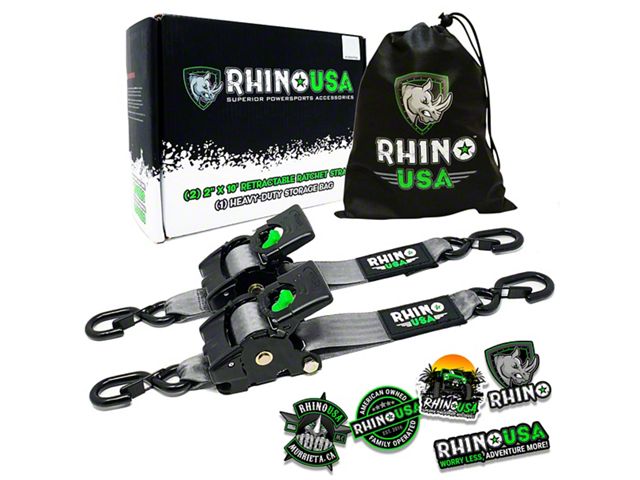 Application. The Rhino USA 2-Inch x 10-Foot Retractable Ratchet Straps are universally compatible, making them suitable for a variety of cargo and tie-down needs.