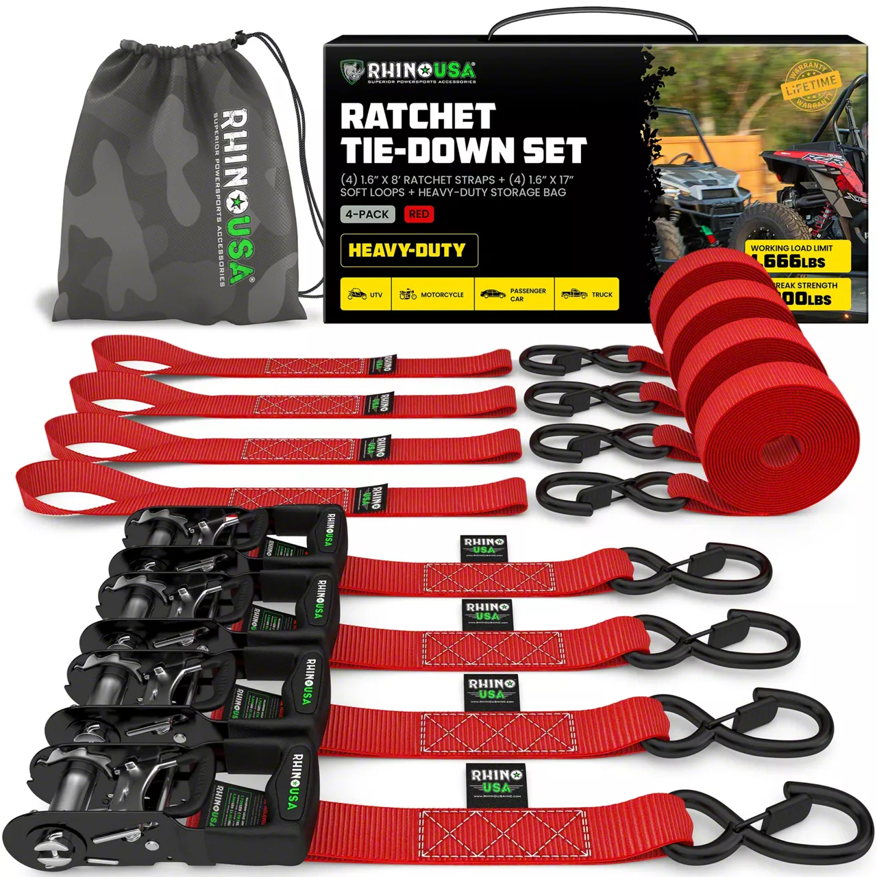 Rhino USA 1.60-Inch x 8-Foot Heavy Duty Ratchet Tie Down Kit; 4-Pack; Red