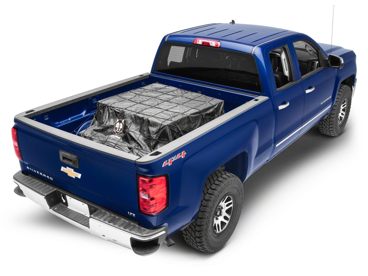 Maximum Cargo Protection. Eliminate the problem of tangled cargo nets and bulky tarps with Rightline Gear Truck Bed Cargo Net with Built-In Tarp. This bungee-style cargo net is attached to a tough lightweight tarp that gets rid of net tangling and secures cargo to your Silverado 1500' bed, while keeping it dry. Relocatable hooks adjust the size and tension, while angled attachment points allow the cargo net to be individually stretched in all directions for a tighter and more secure fit.