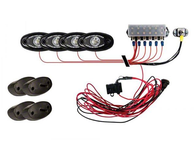 Description. The RIGID Rock Light Kit uses the power and durability of A-Series LED lighting and adds custom 15 foot leads on each light, switch and angled mounts to light up the undercarriage of any truck, Jeep, or all-terrain vehicle. This kit will allow you to light up the trail with strategically placed lights on the vehicle. Perfect for night rock crawling, the LED lights are available in a variety of colors, including white, red, blue, or amber to aid night vision or accent vehicle colors. RIGID Rock Light Kits are available in 4-light or 6-light configurations to enhance and customize your night crawling experience. Own The Night with the original LED Rock Light Kit.
