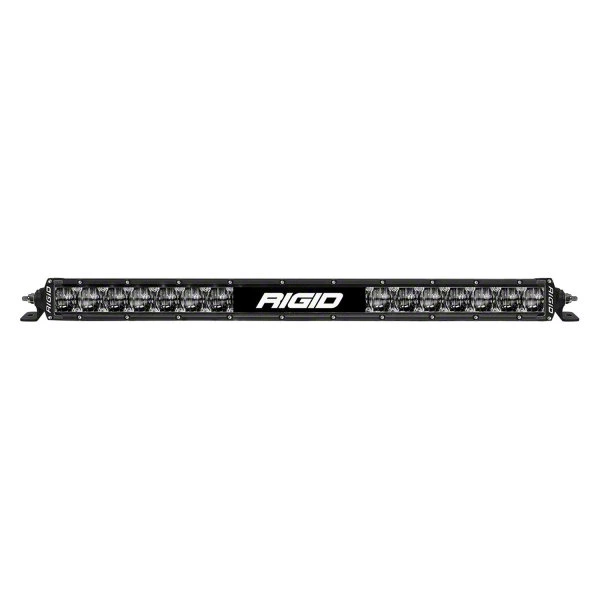 Advanced Lighting Performance. The Rigid Industries SR-Series LED Light Bar is a twenty-inch model designed for universal application, featuring a matte black finish aluminum alloy housing and a clear transparent lens. It offers a driving beam with a dual function, including a high beam mode for enhanced visibility. This LED light bar is SAE compliant and engineered to provide a lifetime of 50,000 hours, making it a reliable choice for various lighting needs.