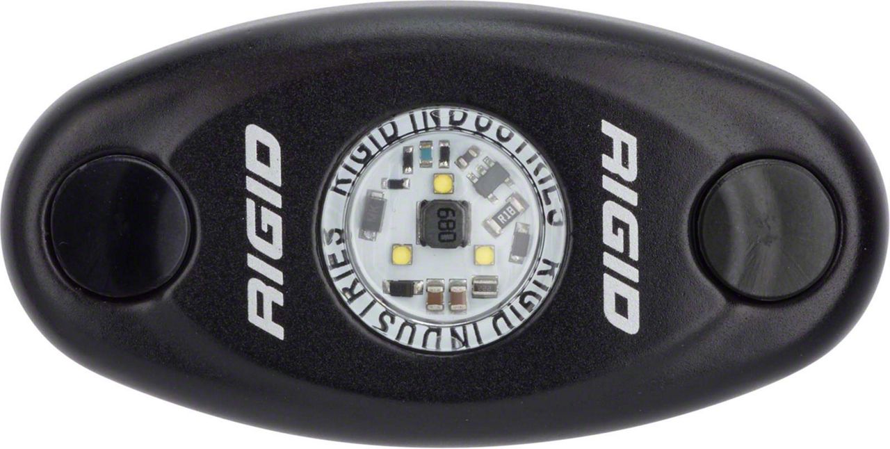Description. RIGID's A-Series LED Accessory Light is the universal light that can be used just about anywhere. Vehicle cabs, boat cabins, work vehicle beds, under the hood of a vehicle and trunks are just a few of the places where the A-Series can provide handy bright lighting in otherwise dark environments. The A-Series has a durable compact aluminum housing and includes rubber flat-mount, a two way pad for flat mounting, and radius tube-mount adapters, which provide side or bottom wire exits to accommodate different applications. It is lightweight, waterproof, and available in a variety of different LED colors in high and low power versions. The versatility of the A-Series makes it an easy installation on almost anything.