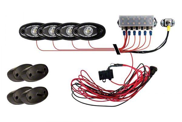 Description. The RIGID Rock Light Kit uses the power and durability of A-Series LED lighting and adds custom 15 foot leads on each light, switch and angled mounts to light up the undercarriage of any truck, Jeep, or all-terrain vehicle. This kit will allow you to light up the trail with strategically placed lights on the vehicle. Perfect for night rock crawling, the LED lights are available in a variety of colors, including white, red, blue, or amber to aid night vision or accent vehicle colors. RIGID Rock Light Kits are available in 4-light or 6-light configurations to enhance and customize your night crawling experience. Own The Night with the original LED Rock Light Kit.