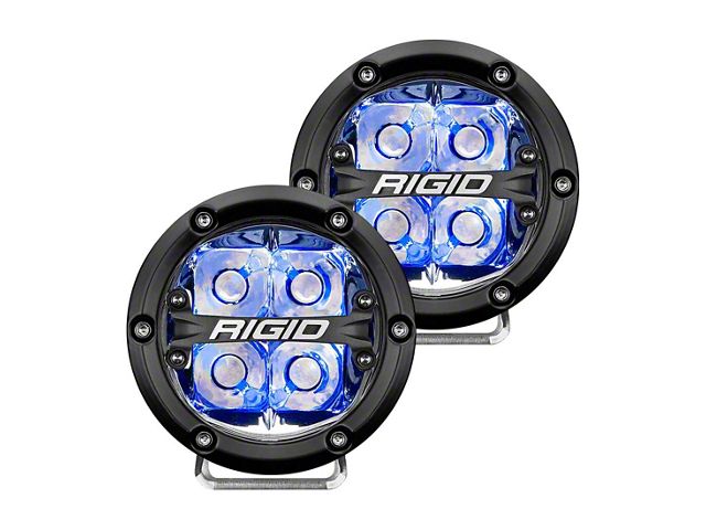 Description. RIGID introduces the all-new 360-Series family of LED lights. The optimized beam patterns project up to 8,600 raw lumens and are protected by an aluminum housing, features a blacked-out circuit board, prominent RIGID branding, and limited lifetime warranty making them the most robust and useful round lights on the market. Choose between a 4-inch or 6-inch light, preferred backlight color, and beam pattern for a customized experience and look. RIGID’s 360-Series feature beam patterns available from 17 degrees to 60 degrees, offering an option for any application. Available in 4 backlight colors: red, white, blue or amber. RIGIDs 360-Series round lights seamlessly integrate into multiple OEM applications and makes it easier than ever to Own The Night. Harness sold separately.