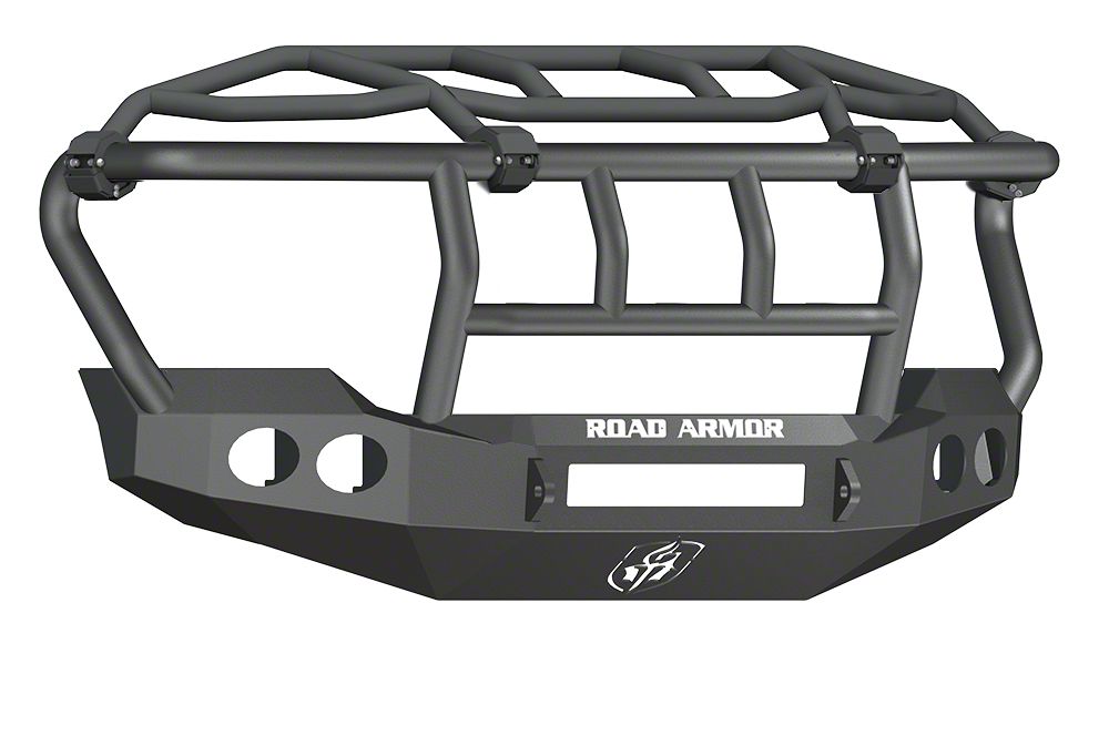 Radical Front End Protection. The Road Armor Stealth Textured Black Non-Winch Front Bumper with Intimidator Guard is the front bumper assembly that offers complete front end protection with a radical style. This front bumper features the familiar geometric off-road design but with the addition of the extraordinary Intimidator guard. This guard features a design that’s reminiscent of a cage and completely covers your Super Duty’s front end, including a portion of its hood. By doing so, this guard provides extreme front-end protection a look that’s as intimidating as its namesake. Additionally, this Intimidator guard can swivel upwards, allowing you to pop the hood when needed.