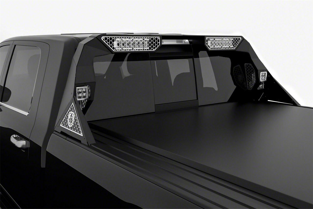 Enhanced Protection and Style. The Road Armor iDentity Hyve Mesh Headache Rack with Bedrail Pods and Dual 10-Inch Center Light Pod offers superior protection for your rear window and cabin while elevating your truck's style. Designed with a distinctive Hyve mesh pattern, it enhances aesthetics while providing practical functionality, including a third brake light relief for added safety.