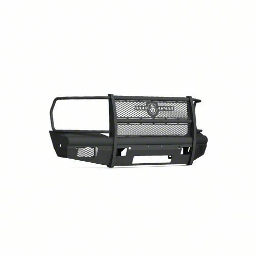 Sturdy Gauge. Introducing the Road Armor Vaquero Non-Winch Front Bumper with Full Guard - a perfect fusion of robustness and elegance for your RAM 3500. Crafted with a sturdy 11-gauge steel material, it boasts 1/4-inch gusseting and internal bracketry, ensuring unmatched durability. The five-stage textured black finish adds a sleek, sophisticated touch to your vehicle. Proudly made in the USA, its quality speaks volumes.