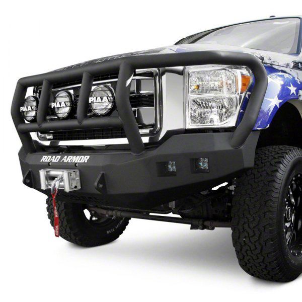 Titan II Guard. Road Armor offers bumpers with various front guard configurations, from no-guard to the oversized intimidator guard. This particular bumper includes Road Armor’s Titan II guard, a heavy-duty, full-coverage, .120-wall tubular steel guard. This guard offers excellent protection to critical front-end components like headlights, grille, intercooler, radiator, A/C condenser, and various fluid coolers.