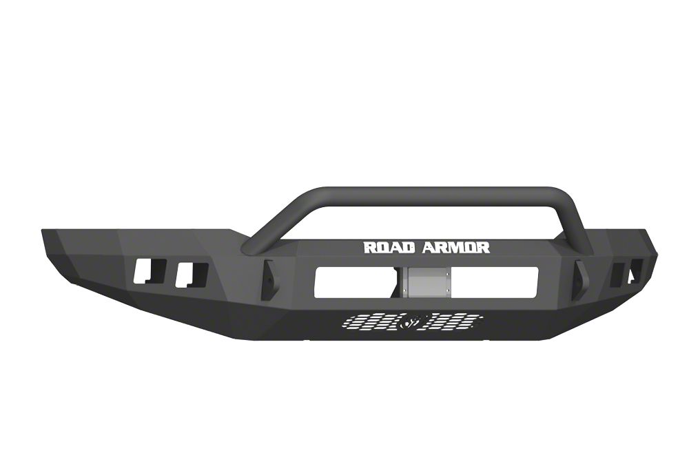 Precision-Cut Steel Build. The Road Armor Satin Black Stealth Front Bumper with Pre-Runner Guard is completely precision-formed, using advanced CNC machines, for an exact fit on your truck. Its 0.187-inch thick, descaled A36 steel construction gives this component exceptional strength, which is further enhanced by internal gusseting and bracketry. Fully welded 0.875-inch thick shackle mounts accepts a wide range of aftermarket shackles. Finally, its satin-black powder coat finish is applied using a unique 5-step method for exceptional rust resistance.