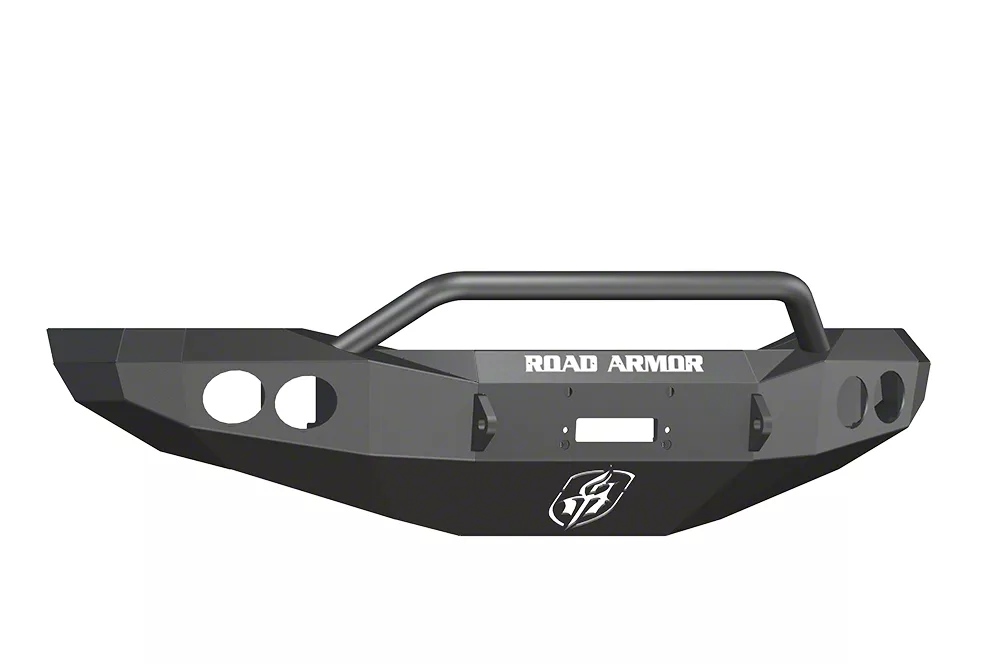 Prepare for Battle. Prepare your RAM for battle with the Road Armor Stealth Winch Front Bumper w/ Pre-Runner Guard & Round Light Mounts - Satin Black. This bumper brings a rugged style, and it's loaded with the features you want, including a foot forward winch mount that accommodates a WARN M12000, Smittybilt XRC winch or similar. It is designed specifically to complement your truck ensuring a precise fit and outstanding performance.