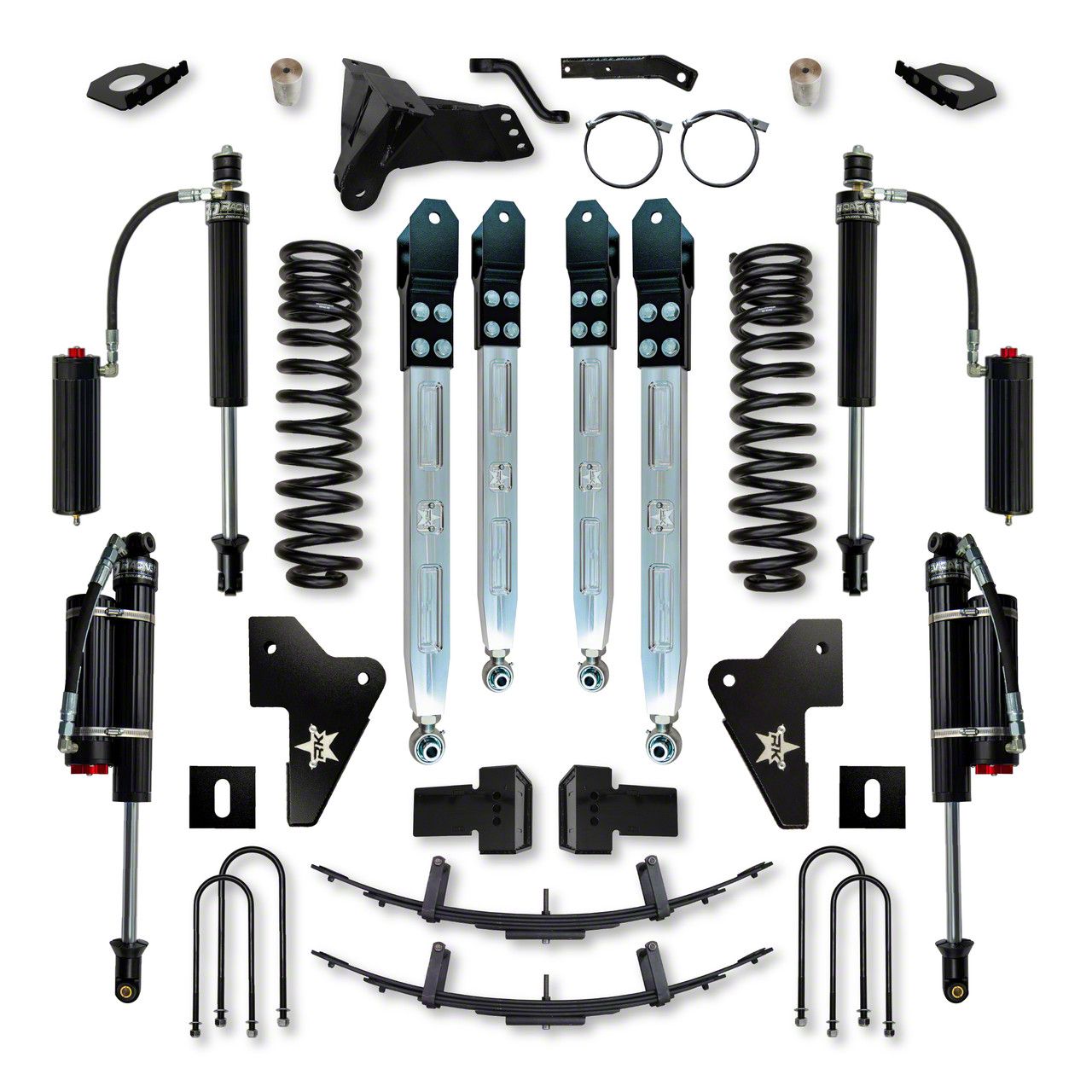 The RK Suspension 4.0" Lift Height X-Factor Pro Elite System for the Ford Super Duty is expertly engineered to elevate both ride quality and performance, making it the ultimate upgrade for your everyday workhorse or adventure vehicle. Every component is precision-crafted in-house to optimize factory geometry, ensuring enhanced off-road stability for those who crave the thrill of the trail. It all starts with the tuned multi rate coils. Then we enhance them with our PB+J (Pure Beef and Jealousy) 4 Links and 4 Link geometry that provides improved axle control, removes suspension bind found in conventional radius arm systems, and allows for much smoother articulation off road. The rear mini pack enhances and smooths out the OEM leaf pack for yet again, smoother on high ride and better off road performance. But we also understand that your truck isn’t just for play—it’s a workhorse. Whether you're navigating city streets, conquering rugged terrain, or towing heavy loads, RK Suspension delivers the reliability, strength, and performance needed to tackle any challenge with confidence!