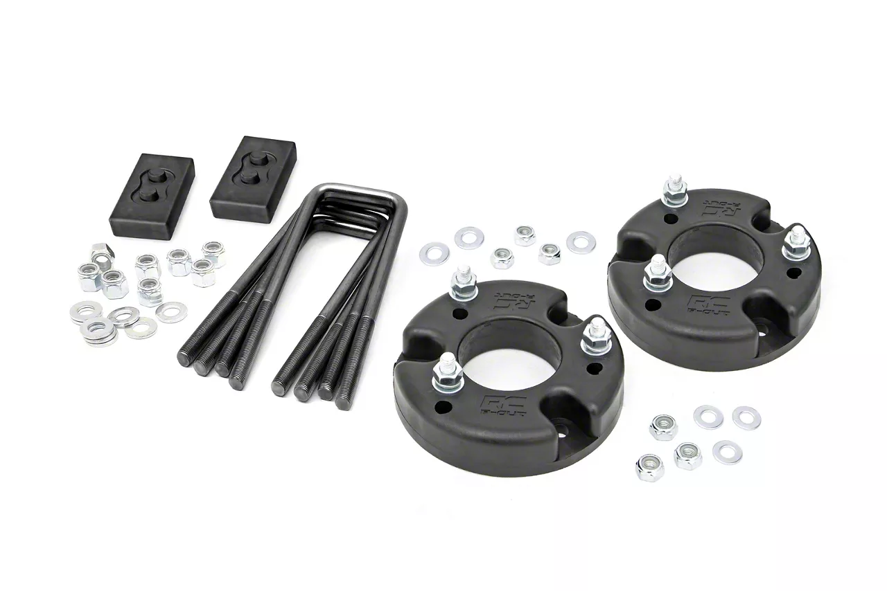 Sturdy Spacers. This lift kit comes with 2-inch strut spacers for the front and 1-inch lift blocks for the rear. Manufactured from a heavy-duty proprietary composite material, these spacers are strong and dense and will never rust or succumb to the elements.