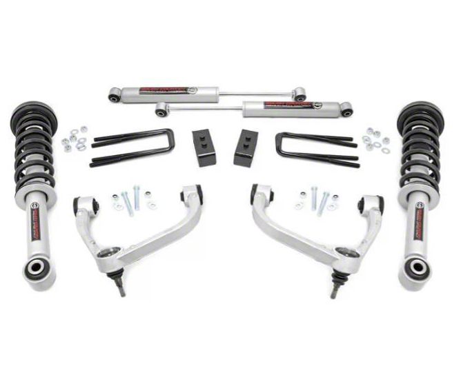 What Else is Included. The Rough Country 3 Inch Bolt-On Suspension Lift Kit with Upper Control Arms features N3 Nitrogen-charged shocks, a set of strut spacers and fabricated rear blocks.