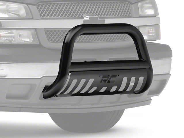 Excellent Front End Protection. Provide your Chevy truck with excellent front-end protection that looks good with the Rough Country Black Bull Bar. This rugged bull bar assembly’s rugged tubular steel frame and heavy-gauge plate work together to deflect any hazards you might encounter, especially when off-roading. While this assembly by itself already adds an aggressive touch to your truck, the protective plate is die-cut with grates and the RC logo, further enhancing its looks.