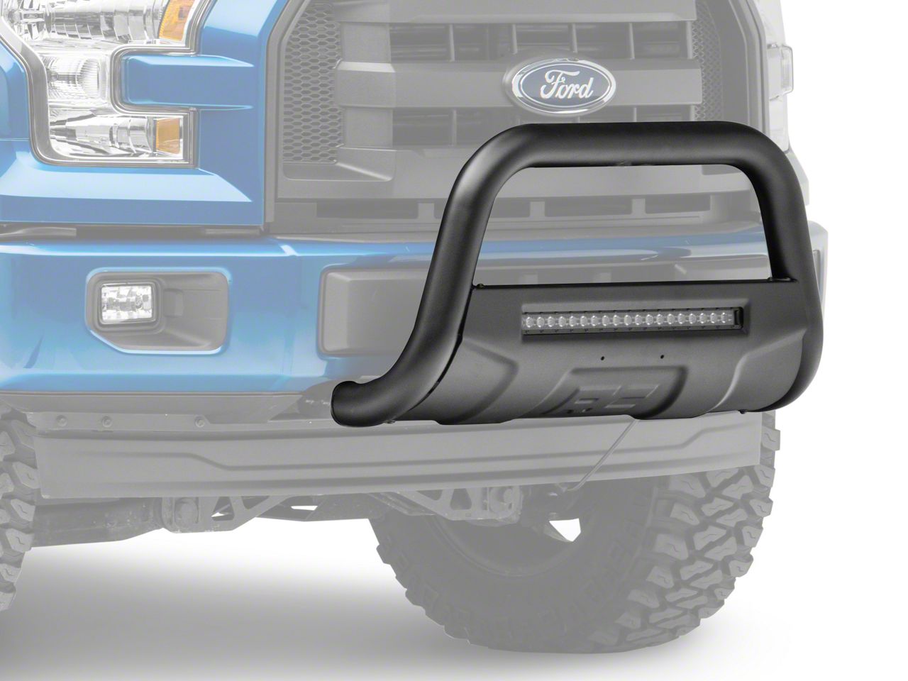 Practical Protection and Lighting. Give your F-150 truck practical front-end protection and nighttime visibility with the Rough Country Black Bull Bar that includes a 20-Inch Black Series LED Light Bar. This bull bar comes with an integrated LED light bar that’s more than enough to light any off-road trail. Meanwhile, its beefy, all-steel construction protects your grille and front fascia from impact damage.