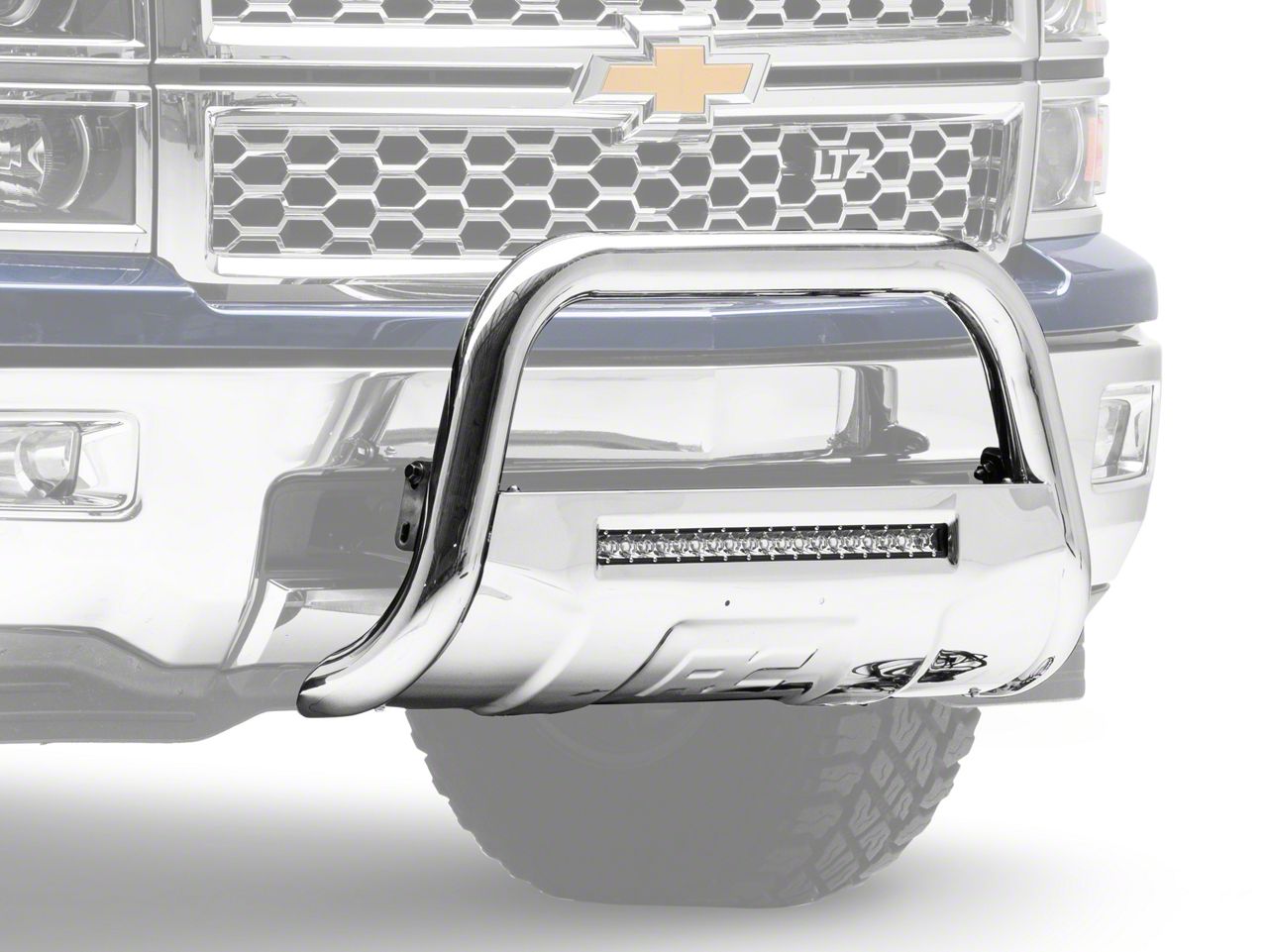 Trail Hazard Protection. Prevent damages to your Chevy’s front-end with this Rough Country Bull Bar with LED Light Bar; Stainless Steel. From bushes to rocks or whatever type of trail hazard you may encounter, this bull bar will keep them at bay. What’s more, this bull bar comes equipped with a 20-inch LED light bar to help you illuminate the road at night.