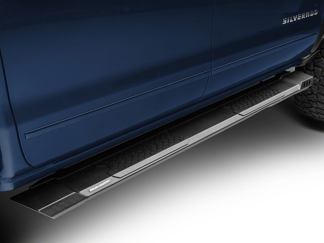 Wider Steps. Replace your old running boards with these black Rough Country Cab Length HD2 Running Boards. These running boards feature a cab length design with wider non-skid steps for a more reliable and stable footing. Furthermore, these running boards double as side protection against trail hazards that might damage the sides of your Silverado 1500.