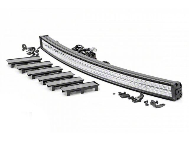Reliable Off-Road Lighting. Illuminate your path with the Rough Country 50-Inch Chrome Series Curved Dual Row Cool White DRL LED Light Bar; Flood/Spot Combo Beam. This powerful LED light bar delivers outstanding brightness and versatility, ideal for off-roading, night driving, or any situation that requires enhanced visibility. This 50-inch light bar features a dual-row design, boasting a multitude of high-intensity LEDs that produce a cool white light. It provides an impressive flood/spot combo beam pattern, creating a wide field of illumination to light up both your immediate vicinity and the distance ahead. The DRLs enhance your vehicle's visibility during the day, improving safety and adding a sleek, modern look to your vehicle.