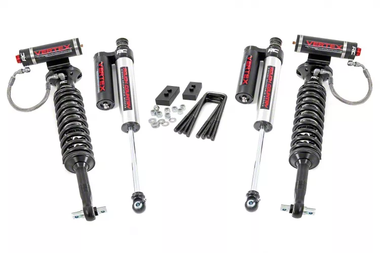 Go Off-Road. Off-roading can be tough on your F-150’s stock suspension, that's why you need a leveling lift kit that was specifically designed to take on the great outdoors. Luckily, this Rough Country 2-Inch Front Leveling Lift Kit has what you need to help you take on the obstacles found on and off-road. With 2 inches of lift, this kit can accommodate tires up to 33x12.50 R20 in size. This Rough Country Kit features composite lift blocks for extra strength. What’s more, the included Vertex Adjustable Front Coilovers and Vertex Reservoir Rear Shocks will provide a highly comfortable ride, even when tested across rough terrain.