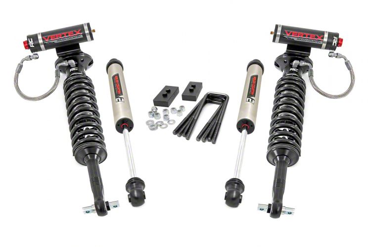 High-Performance Shocks. This 2-Inch Leveling Lift Kit perfectly combines the unmatched performance of Rough Country’s Vertex Coil-Over Shocks and V2 Monotube Shocks. This combination offers 10-stage variable valving that provides outstanding flexibility in handling. The Vertex Coil-Overs also feature massive pistons that offer greater fluid capacity than factory shocks. On the other hand, the V2 Monotube Shocks feature an internal floating piston design that is intended to separate the shock oil and high-pressure nitrogen for faster reaction in extra-duty driving conditions.