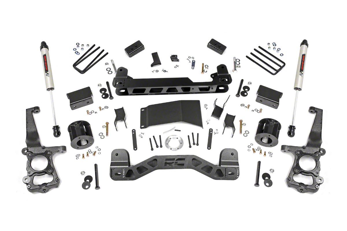 Increases Ground Clearance. For higher ground clearance, equip your F-150 with this Rough Country 4-Inch Suspension Lift Kit with Premium N3 Shocks. This suspension lift adds about 4 inches of lift height to your truck, allowing you to easily drive over challenging trails. What’s more, adding this suspension lift gives your truck a taller and more aggressive look.
