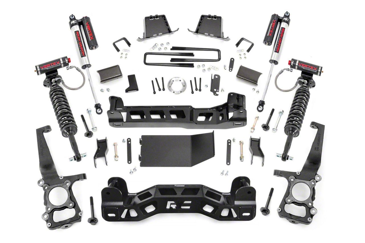 Maintains Factory-Ride Performance. Make your Ford F-150 more capable of off-road mayhem by installing this Rough Country 6-Inch Suspension Lift Kit with Adjustable Vertex Coil-Overs and Vertex Shocks. This kit raises your truck by 6 inches, enhancing ground clearance to let you install up to 35-inch tires. What’s more, it levels your truck’s front and rear and provides a factory-ride quality while displaying a new, aggressive exterior appearance.