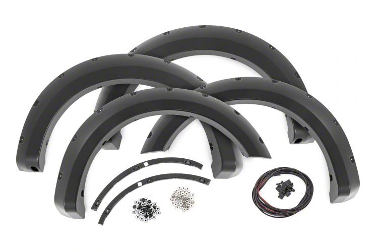 Increase Tire Coverage and Add Rugged Style. The Rough Country Pocket Fender Flares provide added tire coverage, protecting your F-150 from road debris while giving it a bold, off-road-ready look. Finished in tuxedo black, these flares seamlessly match the style of your vehicle, making them a great enhancement for your F-150.