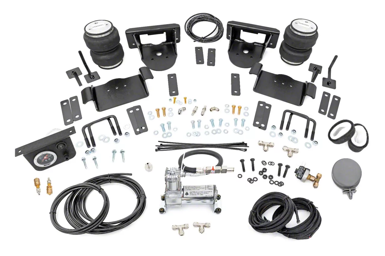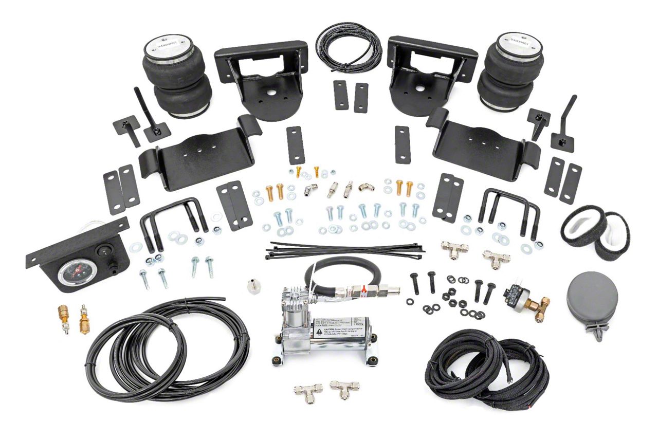 Efficient Leveling Power. The Rough Country rear air spring kit with OnBoard air compressor allows perfect leveling for your F-150. The kit provides between 0 and 6inches of lift that guarantees load support up to 5,000 Pounds. If your F-150 is used for work, this kit will allow enough leveling power to secure the vehicle and deliver efficient performance.