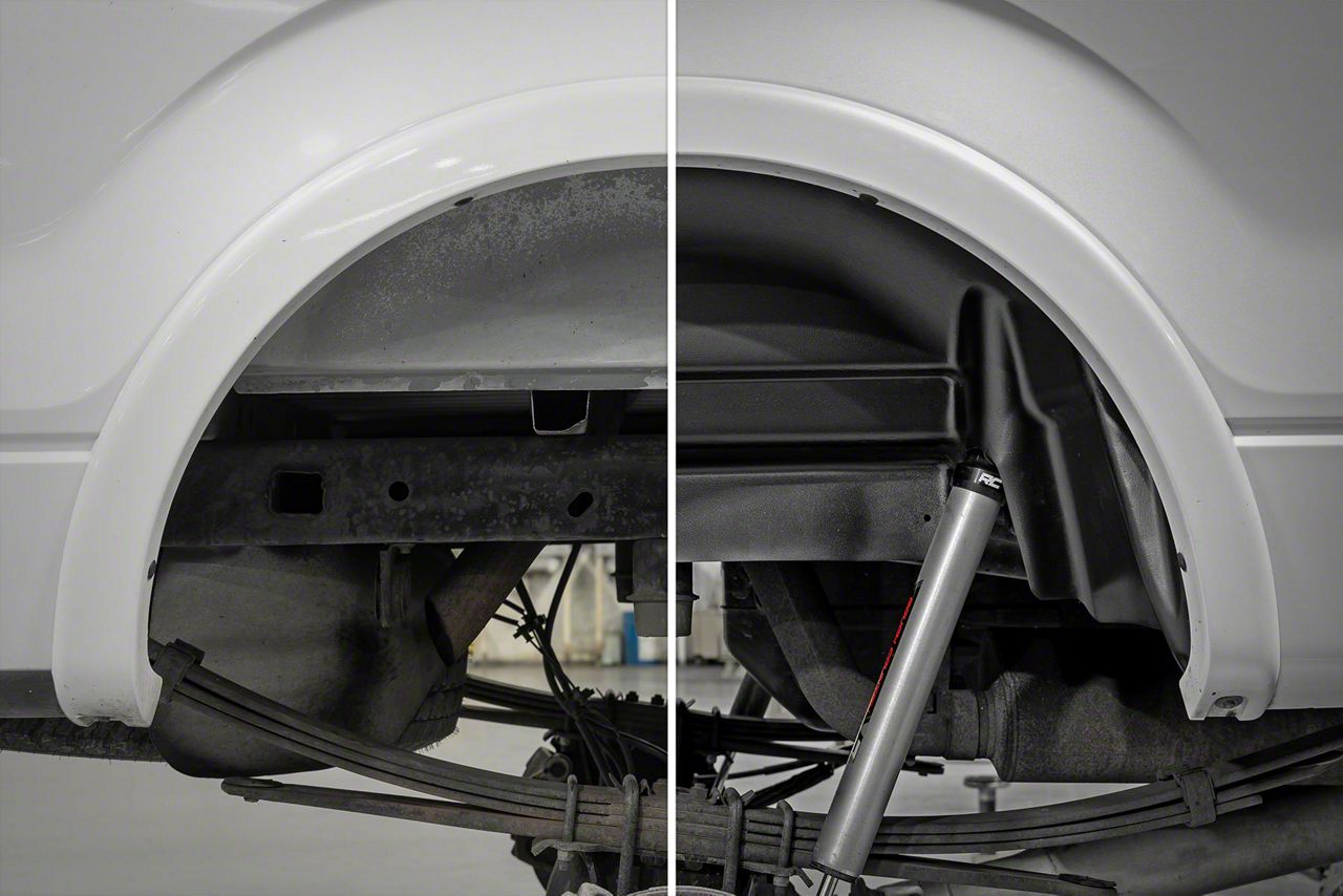 Enhanced Protection and Cleaner Look. Protect your F-150’s rear wheel wells with Rough Country Rear Wheel Well Liners. Designed to shield against dirt, debris, and corrosive road salt, these liners keep your truck's undercarriage clean and protected. In addition to offering practical benefits, they enhance the overall look of your vehicle with a polished and finished appearance.