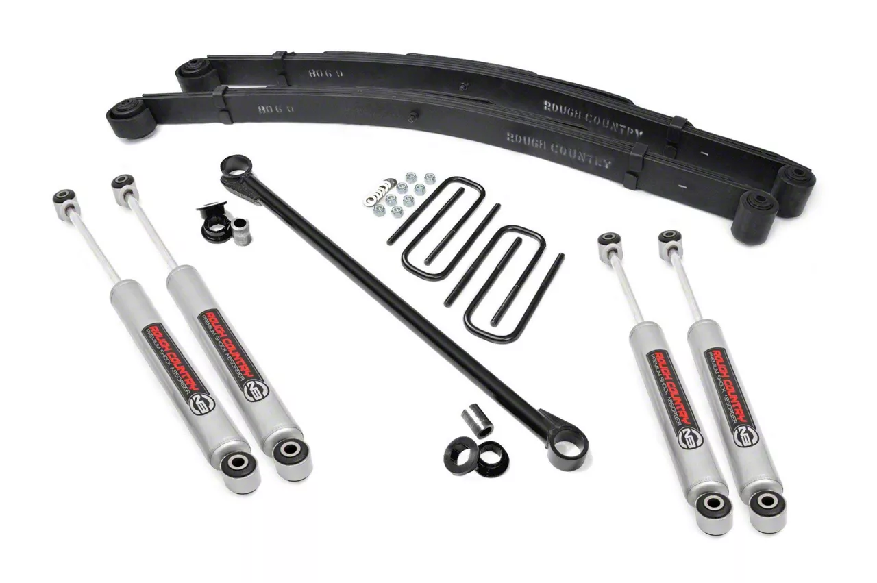 Improved Vehicle Stance and Performance. The Rough Country 2-Inch Front Leveling Kit with Leaf Springs and Premium N3 Shocks provides a 2-inch lift to level the front of your truck with the rear, improving its overall stance. The kit is designed to increase ground clearance, making it ideal for off-road use while also enhancing your vehicle's ride quality and performance.