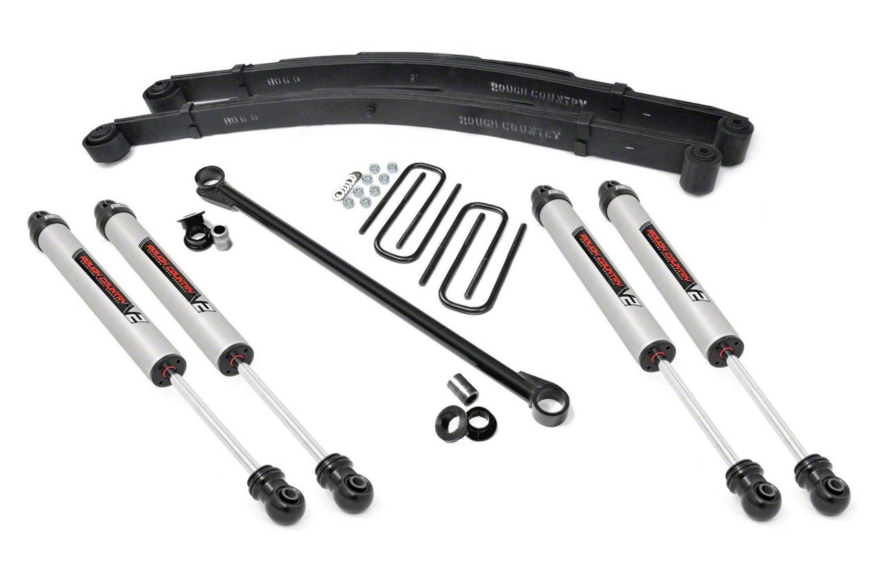 Built to Improve. The Rough Country 2.50-Inch Front Leveling Kit with V2 Monotube Shocks is designed to improve your truck's stance, ride quality, and off-road capability. By raising the front end by 2.50 inches, this kit eliminates factory rake, allowing for larger tires while maintaining proper suspension geometry. The included V2 monotube shocks enhance stability, handling, and overall driving comfort on rough terrain and paved roads alike.