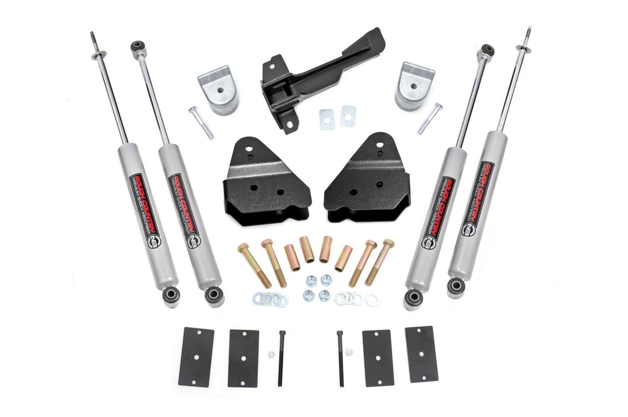 Construction and Appearance. The kit features components with a textured black and raw metal finish, ensuring durability and a sleek look. It includes premium N3 shocks, radius arm drop brackets, coil spring spacers, a track bar drop bracket, leaf spring plates, and all necessary installation hardware.