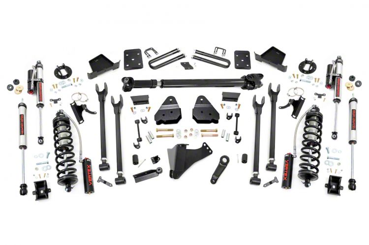 Dominating Any Terrain. The Rough Country 6-Inch 4-Link Coil-Over Conversion Suspension Lift Kit's combination of the 6-inch lift, 4-link conversion, and adjustable shocks significantly improves off-road performance. Increased wheel travel and articulation allow your F-250 Super Duty to navigate obstacles with greater ease, while the adjustable shocks provide enhanced control and stability in challenging terrain.
