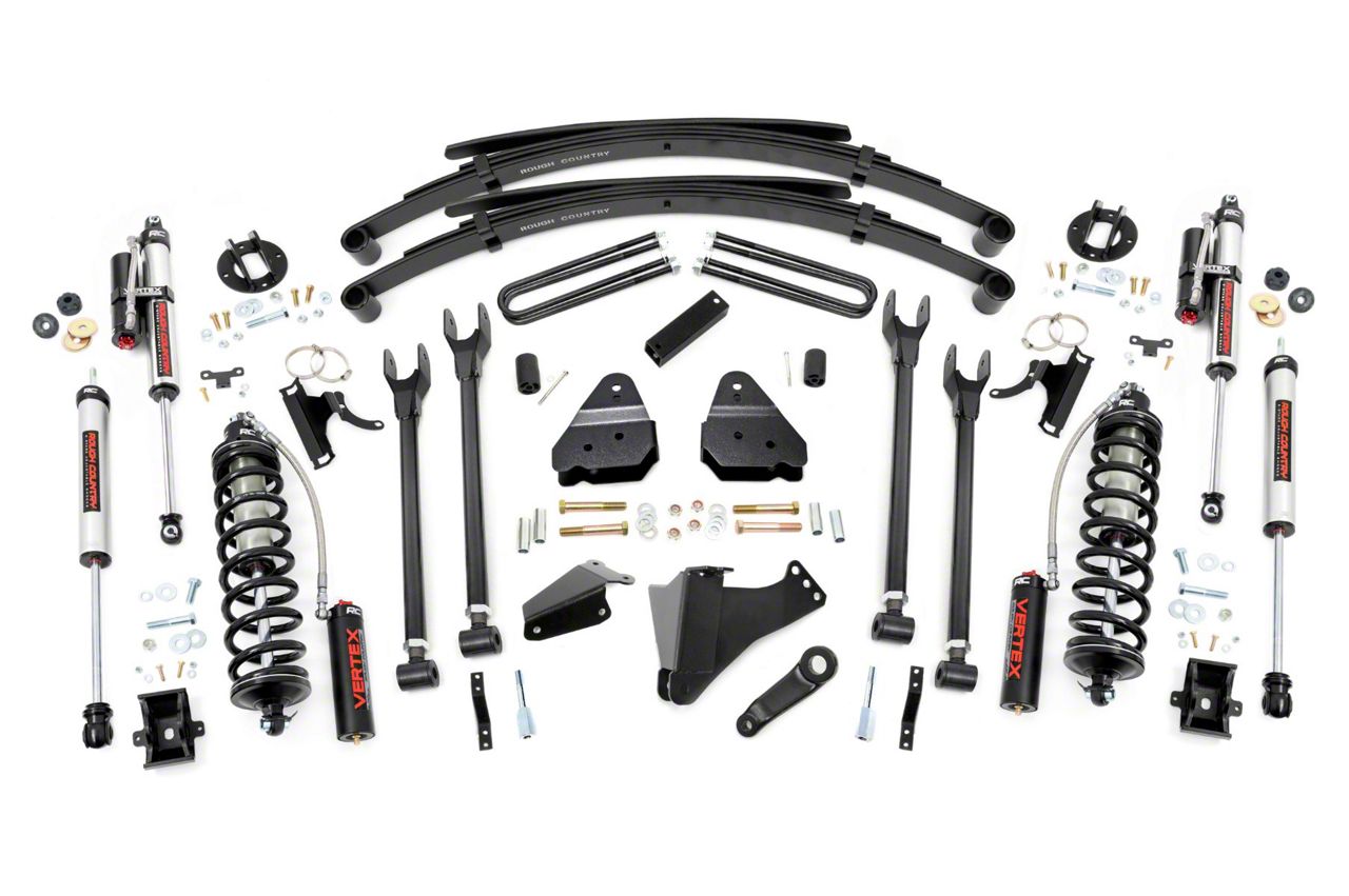 Superior Ride Quality. Give your first-generation Ford Super Duty an impressive upgrade and incredible ride quality with Rough Country's 4-Link Coilover Conversion Lift Kit! This must-have kit is the pinnacle of suspension upgrades. Providing ride height adjustability, increased dampening, and killer good looks. You're sure to set yourself apart from the pack. This innovative kit allows you to replace your factory arms with a 4-Link setup, using Rough Country's durable, fixed upper arms and adjustable lower control arms. A set of radius arm drop brackets maintain proper geometry and allow for proper caster setting, which is crucial to maintaining factory handling.Durable Components. Rough Country's 6" 4-Link Coilover Conversion Lift Kit features top-mounted reservoir brackets and coil-over mounts constructed from 1/4-inch steel. Utilizing this conversion kit you're removing the factory independent coil shock and coil set-up and replacing it with a massive 2.5in piston, nitrogen-charged, 8-stage adjustable Vertex Coilover. Rough Country's Vertex Coilovers feature a monotube design with an external reservoir for increased oil capacity and damping sensitivity. When it comes to investing in a high-end kit, you'll be pleased to find that Rough Country's 2.5in piston design is beefier and offers an impressive 56% greater fluid capacity than the average reservoir shock. Each kit is paired with a monotube shock that provides optimal damping control.Installation. Requiring cutting and drilling to install, an estimated timeframe of 6-10 hours is recommended to complete this full installation. This full kit can be installed at home and can be completed efficiently and quickly!Limited Lifetime Replacement Warranty. Rough Country's 4-Link Coilover Conversion Lift Kit is backed with a limited lifetime replacement warranty towards manufacturer defects. As such, the product is protected from structural and workmanship damage after the date of purchase.