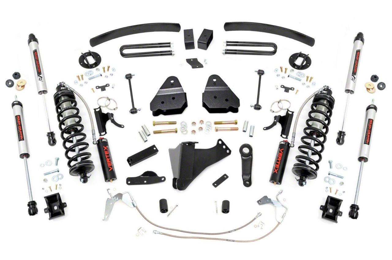 Explore New Heights. Give your second-generation Ford Super Duty superior lift height with Rough Country's 6-inch Coilover Suspension Lift Kit! This all-inclusive kit comes with everything you need for a total transformation of your truck. Run up to 37in tires while preserving the smooth, factory ride quality with this impressive upgrade.Durable Components. When changing a vehicle's suspension, the key to preserving ride quality is keeping the geometry of all suspension components as close to their factory angles as possible. Rough Country's new 6-inch Suspension Lift features a set of ultra-durable radius arm drop brackets, precision fit to bolt right into the factory mounts for an easier install and a more factory-like angle. Utilizing this conversion kit you're removing the factory independent coil shock and coil set-up and replacing it with a massive 2.5in piston, nitrogen-charged, 8-stage adjustable Vertex Coilover. Rough Country's Vertex Coilovers feature a monotube design with an external reservoir for increased oil capacity and damping sensitivity. When it comes to investing in a high-end kit, you'll be pleased to find that Rough Country's 2.5in piston design is beefier and offers an impressive 56% greater fluid capacity than the average reservoir shock. Each kit is paired with a monotube shock that provides optimal damping control.Installation. Requiring cutting and drilling to install, an estimated timeframe of 6-10 hours is recommended to complete this full installation. This full kit can be installed at home and can be completed efficiently and quickly!Limited Lifetime Replacement Warranty. Rough Country's 6-inch Coilover Suspension Lift Kit is backed with a limited lifetime replacement warranty towards manufacturer defects. As such, the product is protected from structural and workmanship damage after the date of purchase. With our industry-leading warranty give yourself peace of mind when using Rough Country's Suspension products!