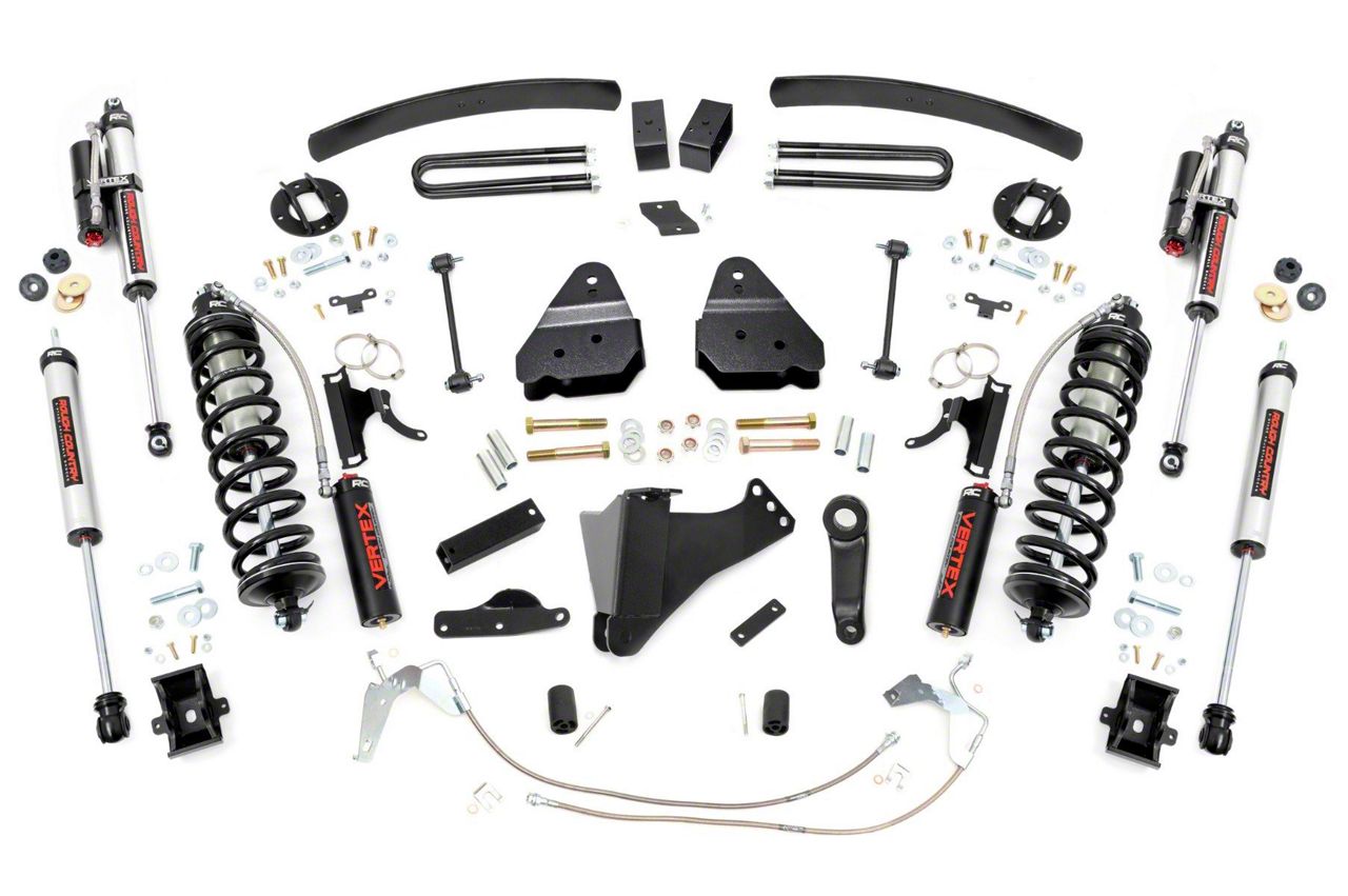 Explore New Heights. Give your second-generation Ford Super Duty superior lift height with Rough Country's 6-inch Coilover Suspension Lift Kit! This all-inclusive kit comes with everything you need for a total transformation of your truck. Run up to 37in tires while preserving the smooth, factory ride quality with this impressive upgrade.Durable Components. When changing a vehicle's suspension, the key to preserving ride quality is keeping the geometry of all suspension components as close to their factory angles as possible. Rough Country's new 6-inch Suspension Lift features a set of ultra-durable radius arm drop brackets, precision fit to bolt right into the factory mounts for an easier install and a more factory-like angle. Utilizing this conversion kit you're removing the factory independent coil shock and coil set-up and replacing it with a massive 2.5in piston, nitrogen-charged, 8-stage adjustable Vertex Coilover. Rough Country's Vertex Coilovers feature a monotube design with an external reservoir for increased oil capacity and damping sensitivity. When it comes to investing in a high-end kit, you'll be pleased to find that Rough Country's 2.5in piston design is beefier and offers an impressive 56% greater fluid capacity than the average reservoir shock. Each kit is paired with a monotube shock that provides optimal damping control.Installation. Requiring cutting and drilling to install, an estimated timeframe of 6-10 hours is recommended to complete this full installation. This full kit can be installed at home and can be completed efficiently and quickly!Limited Lifetime Replacement Warranty. Rough Country's 6-inch Coilover Suspension Lift Kit is backed with a limited lifetime replacement warranty towards manufacturer defects. As such, the product is protected from structural and workmanship damage after the date of purchase. With our industry-leading warranty give yourself peace of mind when using Rough Country's Suspension products!